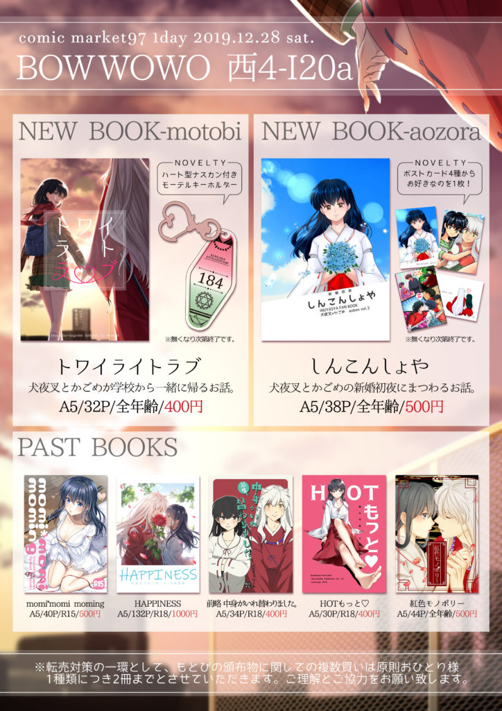 ギャラリー 2019年12月14日 冬コミまであと2週間ですね。少し早いかもですがお品書きです! 今回もあおぞらさんの新刊犬かご本委託させていただきます!イベント限定ポストカードがありますのでぜひおこしください!※ご本人様はいらっしゃいません。 取り置き・スケブはお受けできません。申し訳ありません。 差し入れのお気遣いも不要ですので、どうぞ身軽にお立ち寄りください。よろしくお願いします! ツイート ← トワイライトラブ ツインテ丸様 →